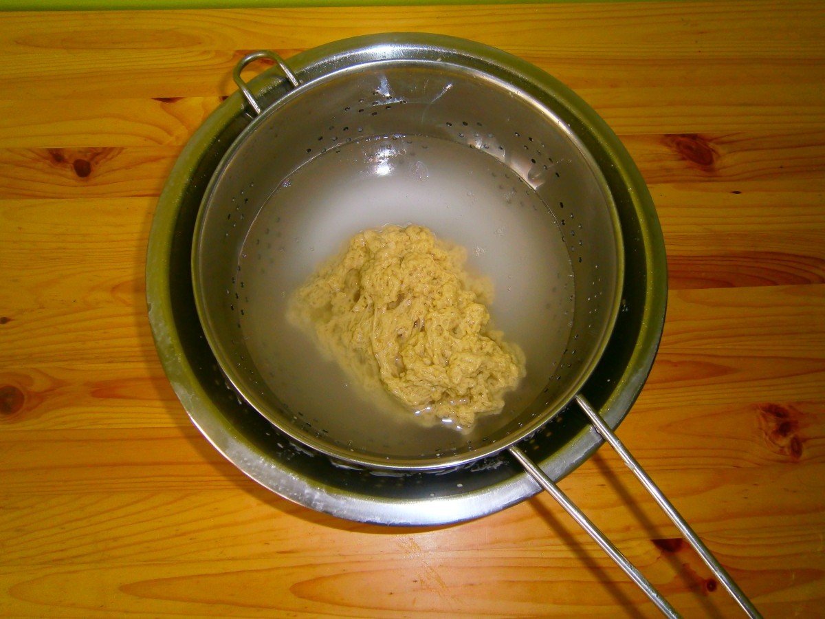 Aby sme získali seitan, teda lepok, musíme z cesta vyplaviť škrob. Najlepšie je cesto položiť na sitko do väčšej misy, do ktorej napustíte vodu. Najprv opatrným pokrčením zvoľna vyplavujeme škrob a akonáhle máme pocit, že je ním voda dostatočne nasýtená, vymeníme ju za novú (použitá sa dá využiť napr. na polievku). Či použiť vodu studenú alebo vlažnú sa zdroje rozchádzajú, skúšal som oboje a okrem tepelného komfortu pre ruky som žiadny rozdiel nepozoroval.