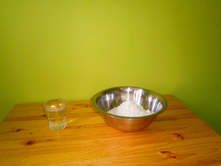 - smiešajte 1kg hladké pšeničné mouky + 0,5l studenej vody